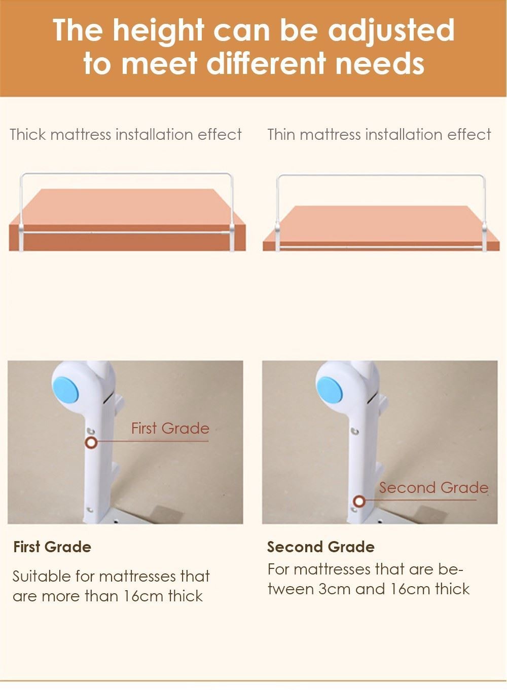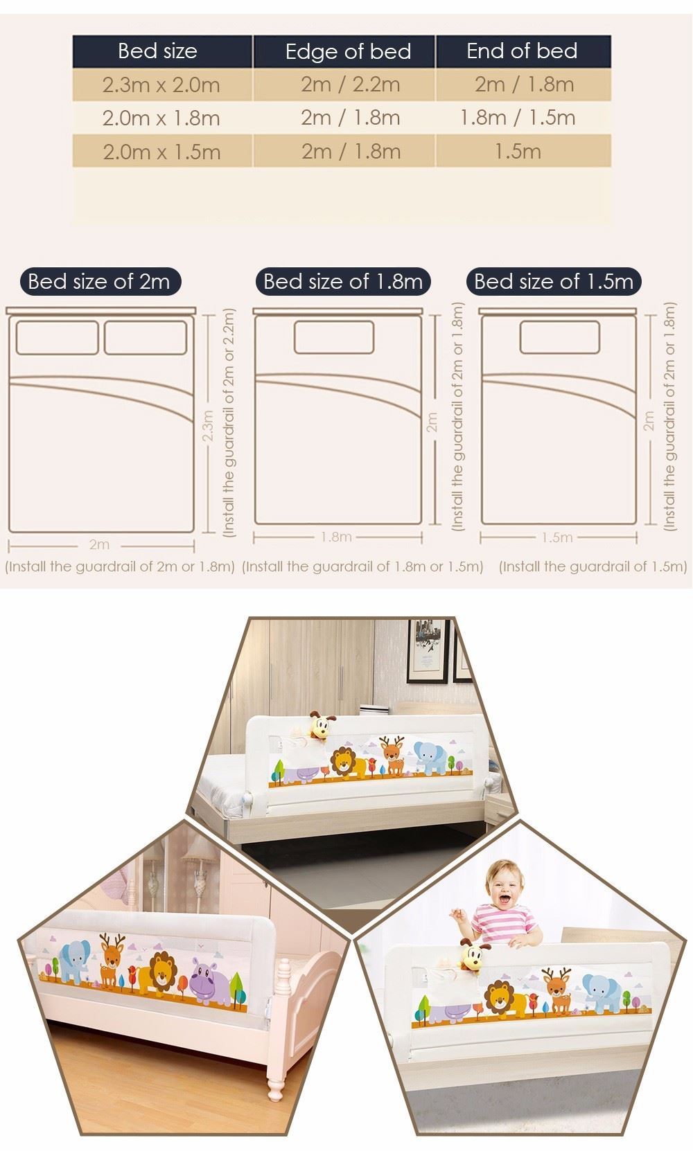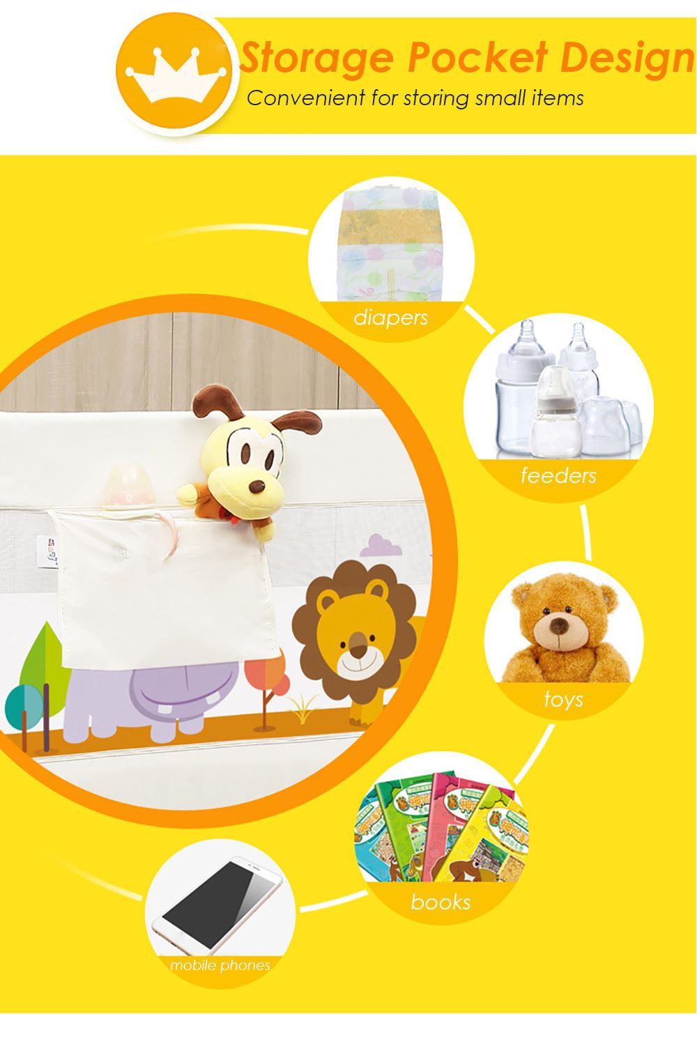 Features: - Steel material with strong bearing capacity, solid, stable and durable. - Heightening fence to safeguard the baby infants. - With pocket design, convenient for storing small items. - Adopts mesh design with breathable fabric, much more practical. - Cartoon animal pattern and colorful design, can improve the baby's imagination. - The height of the bar can be adjusted according to the thickness of the mattress. - Anti-slip fixed design to make a safe and comfortable environment for infants. - Three kinds of size for you to choose and can meet different needs.